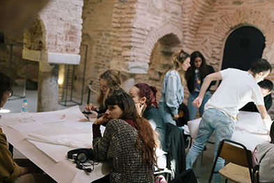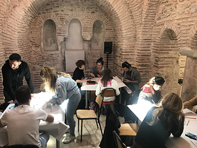 Participating artists at work during the first day of the workshop in the Byzantine Bath Thessaloniki.
