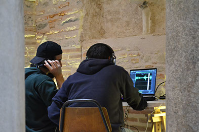 Nikos Kostopoulos with Marios-Leandros Basteas editing audio material from the soundwalks. Byzantine Bath Thessaloniki (2019)